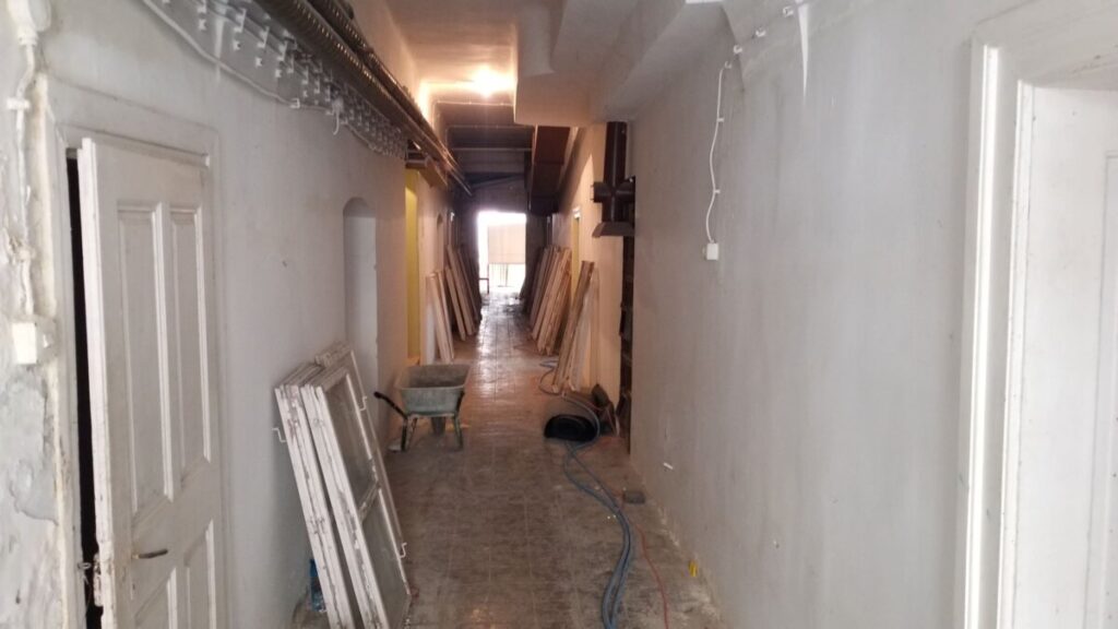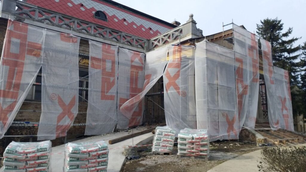 Zbog vremenskih uslova i plana radova, aktivnosti na eksterijeru su trenutno delimično obustavljene. Međutim, radovi su nastavljeni unutar dvorca, gde se u jednoj od donjih prostorija obavlja reparacija unutrašnjih krila prozora i njihova priprema za farbanje. Ova intervencija je važna za očuvanje funkcionalnosti i estetike prozorskih elemenata, kao i za buduću finalizaciju fasade.