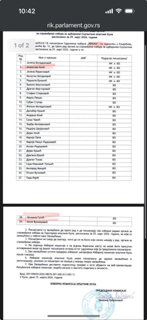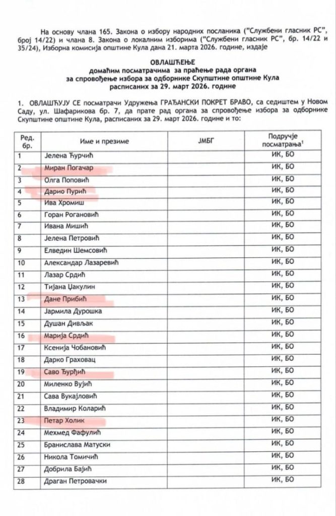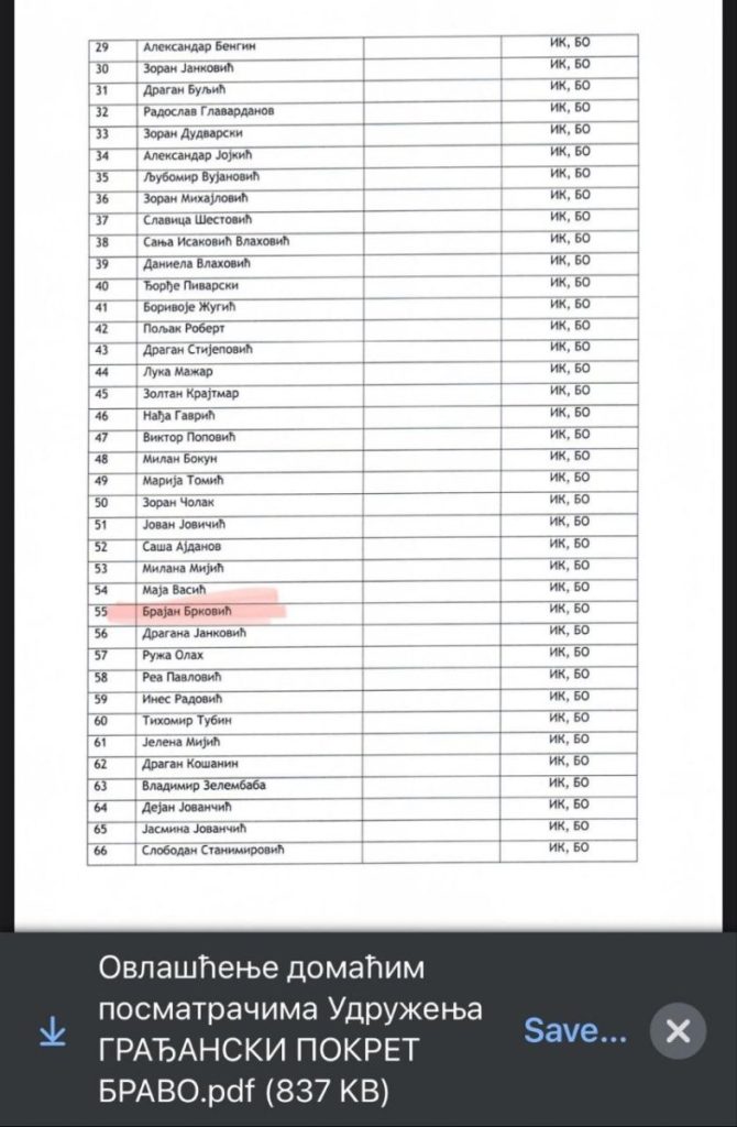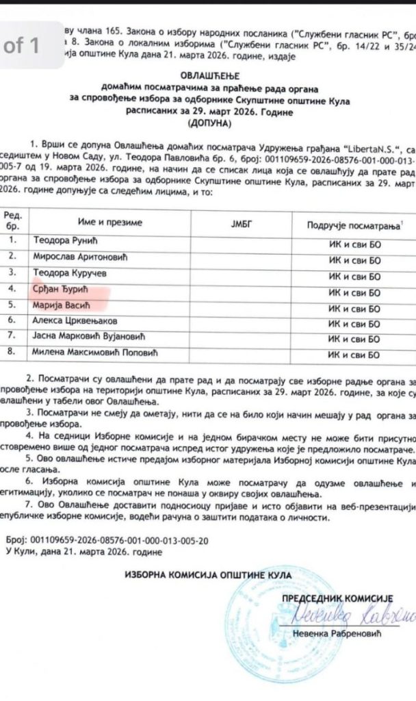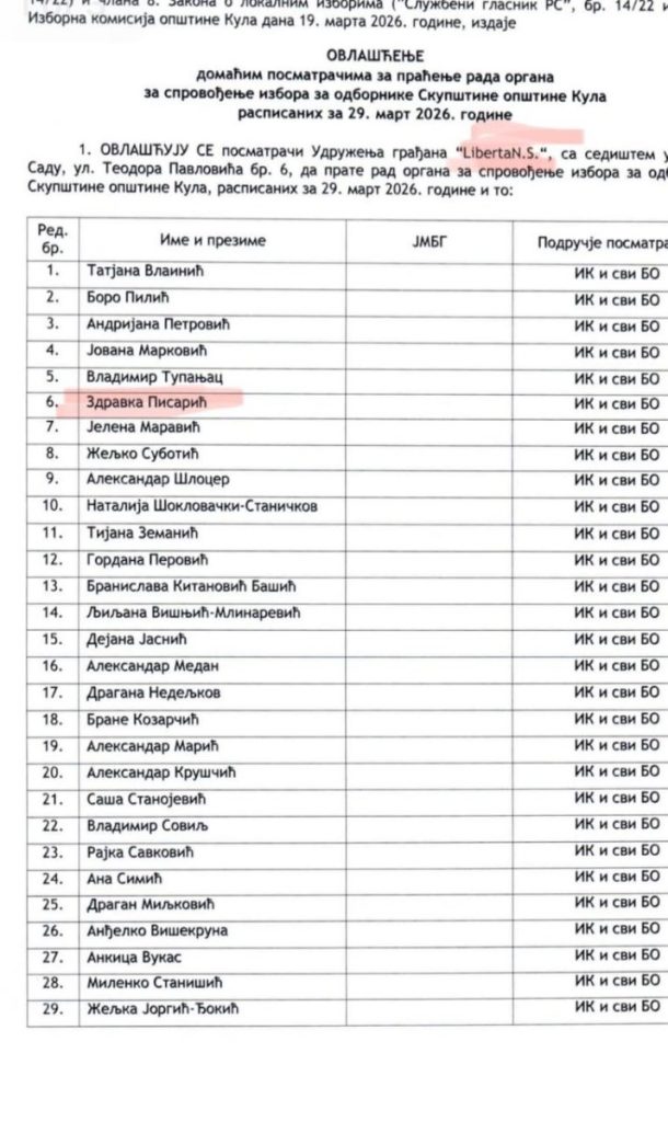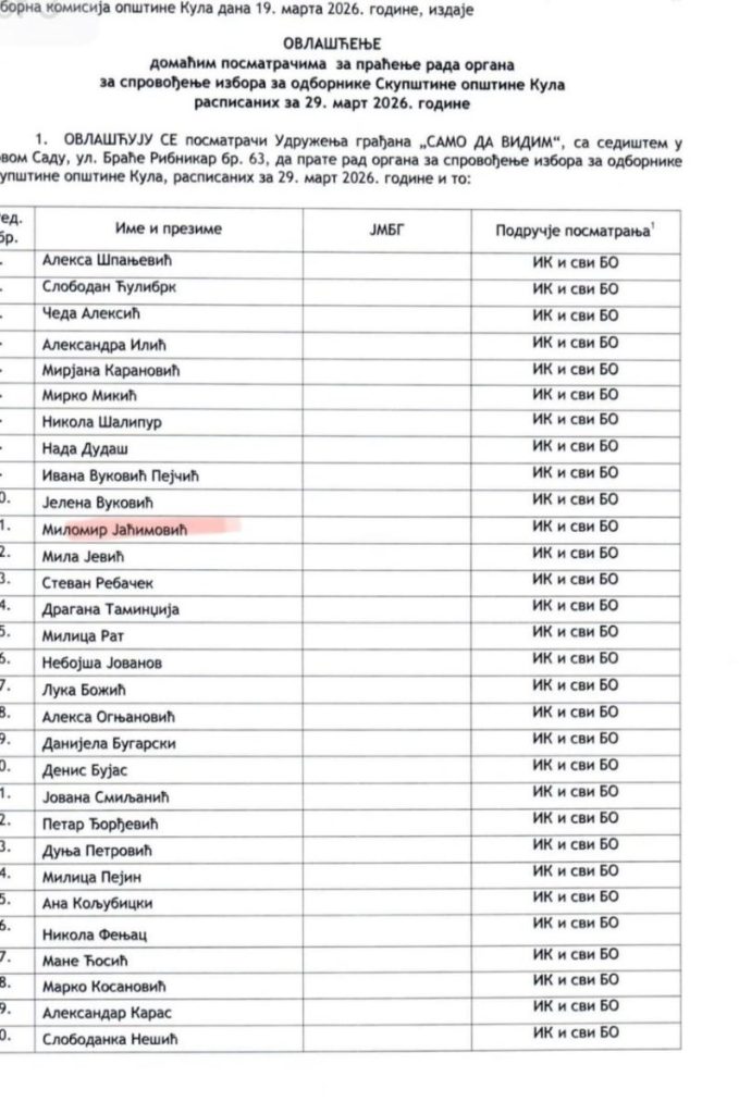 Udruženje građana „SAMO DA VIDIM“, sa sedištem u Novom Sadu, Ul. Braće Ribnikara 63, prijavilo je kao posmatrača Milomira Jaćimovića. Radi se o blokaderskom autoprevozniku, koji ima preko 30 prekršajnih prijava zbog kršenja javnog reda i mira, i kršenje saobraćajnih pravila, ali poseduje i krivični dosije. Šta takva osoba, bez ikakvog predznanja o pravilima rada biračkog odbora, sklona incidentnom ponašanju, uopšte traži u Kuli na biračkim mestima?
