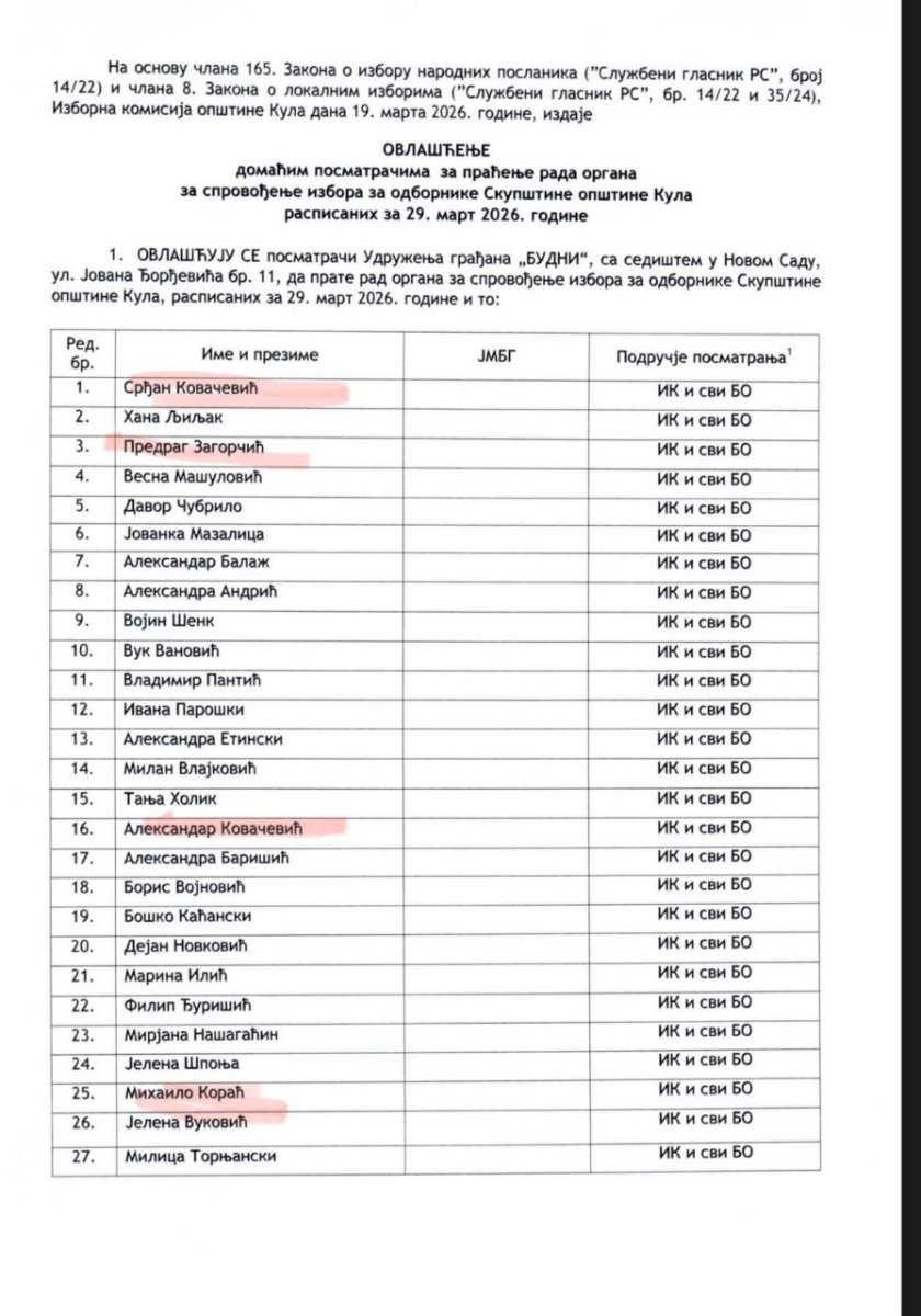 Izborni dan pratiće i advokati Dragana Đilasa i poslovni saradnici Gorana Ješića – braća Srđan i Aleksandar Kovačević. Pošto im posao sa Zborovima građana Novog Sada ne ide kako su zamisli, sada se fokusiraju na Kulu, da i tu pokušaju da mute na biračkim mestima. Sa njima je i koordinatorka pomenutih Zborova, izvesna Hana Ljiljak. Takođe, ispred tog istog udruženja građana „BUDNI“, nalaze se i opozicioni članovi Pokrajinske izborne komisije, kao i roditelji dece koji su se zalagali za blokade nastave u prošloj školskoj godini.