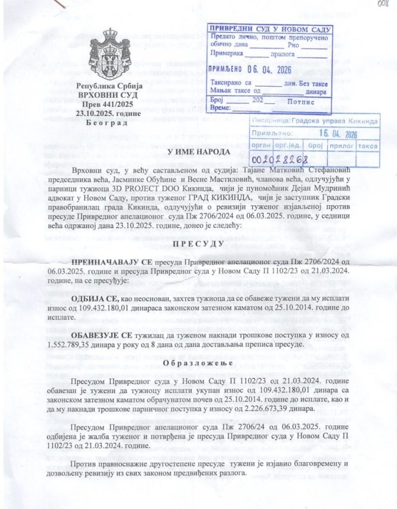 Vrhovni sud Republike Srbije poništio je sve odluke nižih sudova u sporu koji je lokalni tajkun, Zoran Milešević vodio protiv Grada Kikinde.