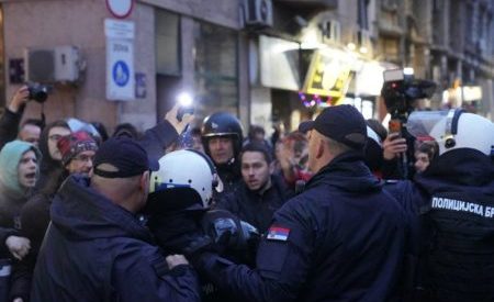 Протест испред Ректората организовали су студенти у блокади због уласка припадника УКП у зграду, а поједини учесници су узвикивали спорне пароле.